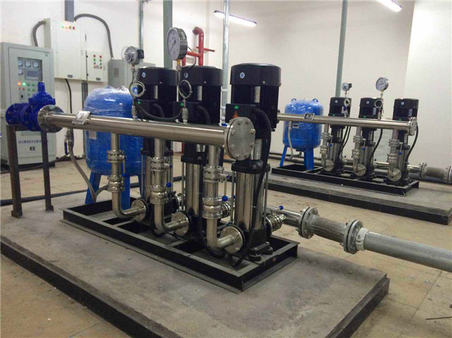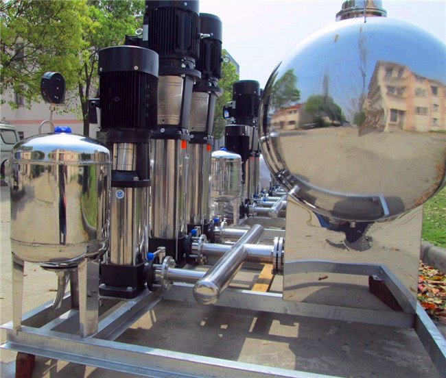 無負壓智能變頻供水設備是有無負壓裝置和智能恒壓變頻設備組成的供水設備。無負壓裝置分為開式和閉式,開式流量調節器為不銹鋼水箱(稱箱式無負壓設備),閉式流量調節器為不銹鋼無負壓罐(稱罐式無負壓設備)。將系統設備串接在市政自來水管網壓力不足的地方,設備通過壓力傳感器檢測出口壓力,將檢測值和設定值進行比較,運算出在市政自來水管網的原有壓力基礎上需要增加的壓力值,確定水泵投入臺數和變頻器輸出頻率(反應到電機及水泵為轉速)以符合用水曲線實現恒壓。